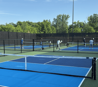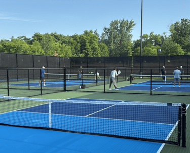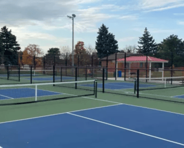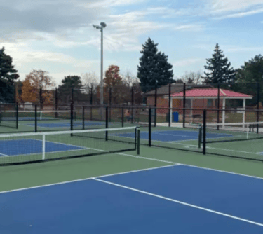 Four dedicated pickleball courts with lights, shade structure and seating.