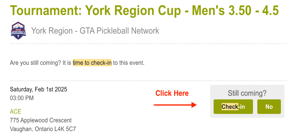 When you click the link above, it automatically takes you to the event page, and it checks you in. Scroll down and if you see a time of check-in beside your name saying “less than a minute ago” you are checked in. You will be booked to play. If you click “No” and click update, you will be removed from the event.